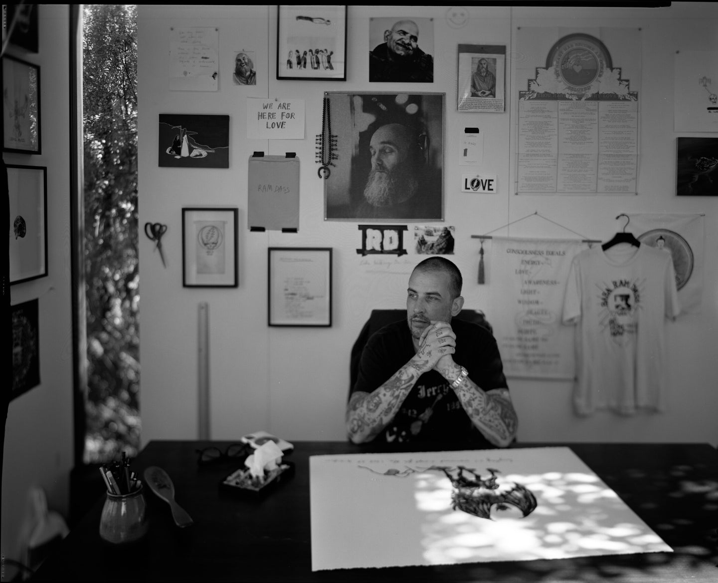 Over the last several decades, artist Wes Lang has been honing his craft and mining the iconography of a post-pop Americana. Lang is an individualist whose heroes—fallen country music icons, jazz musicians, Native American Chiefs—are renegades that have carved their own paths despite adversity. In the Wes Lang universe, recurring figures and symbols— horses, reapers, skulls, birds, the indigenous American, and other totems of the American West— serve as emblems in one way or another for freedom. His frenetic and sometimes manic paintings nod to carefully studied painters such as Twombly, Guston, Basquiat, and Kline. The American West weighs heavy in Lang’s mind, a symbol of the American Dream where ‘going west’ represents the chance to reinvent oneself. Notions of reinvention and awakening resonate deeply with Lang, as frequent references to the Tao Te Ching and the lectures of Ram Dass are scattered throughout the work, revealing a central ethos that underlies the artist’s complex iconography: the affirming power of belief in oneself. The repetition of images and phrases become ritualistic and operate like reaffirming mantras, reminders to “remain at your center” and “be here now.” While Lang’s iconography of skulls and other memento mori might, at first glance, seem to inspire hopelessness, deeper engagement with the work makes it clear that the larger purpose is to help people. To help them understand what they can achieve from life in the short duration they are here, provoking them to take a chance on themselves.